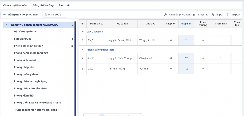 Quản lý, khai báo điều chỉnh thông tin nghỉ phép của người lao động theo từng tháng trong năm, kết chuyển phép từ năm trước sang năm sau.